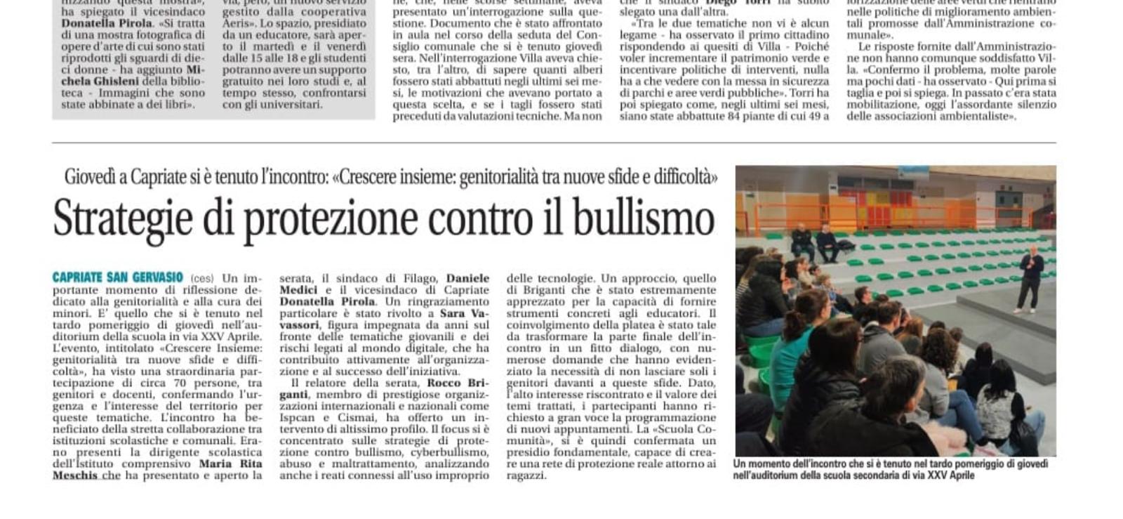 Si è concluso con un bilancio estremamente positivo l’incontro formativo tenutosi giovedì 5 marzo presso l'Auditorium della Scuola Secondaria di Primo Grado di Capriate San Gervasio. L'appuntamento, dal titolo "Crescere Insieme: Genitorialità tra nuove sfide e difficoltà", ha saputo catalizzare l’attenzione della comunità locale su temi centrali per la crescita e la sicurezza delle nuove generazioni.